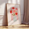 En dristig og uttrykksfull blomsterplakat i røde og rosa toner.